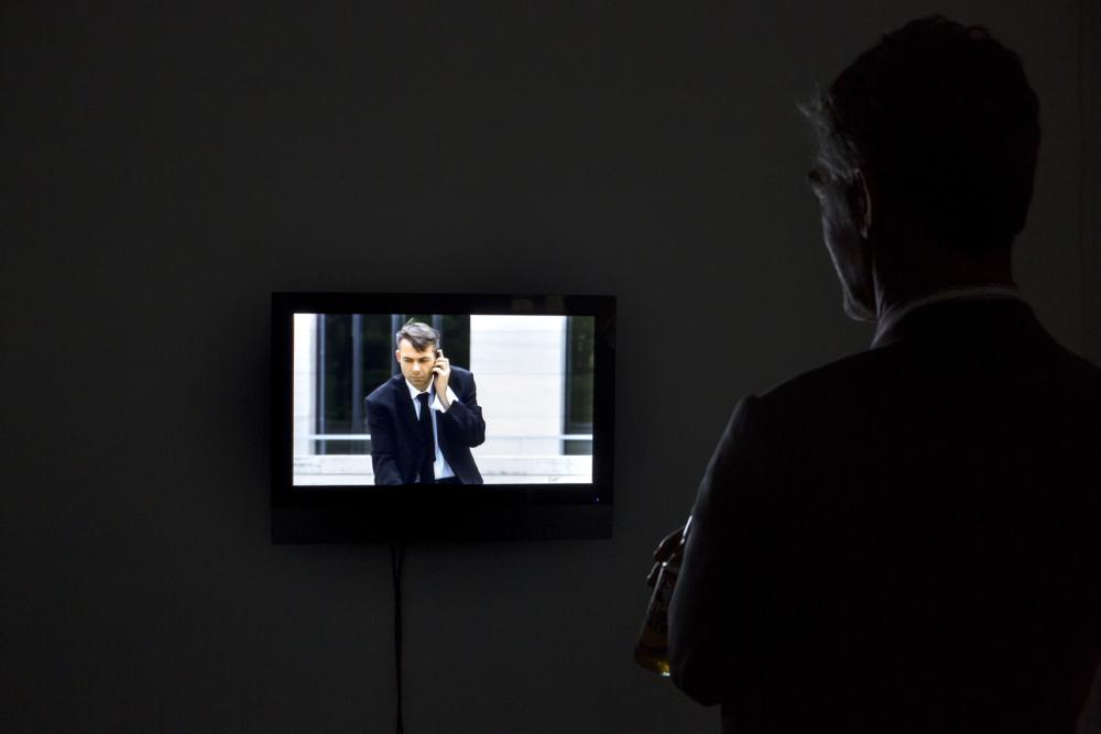 In der Arbeit Mobile bilden Männer ein frei hängendes, ausbalanciertes, leichtes Gebilde, das schon von schwachem Luftzug bewegt wird. Die Fäden des Mobiles sind nicht sichtbar und doch hängen sie an den Schnüren ihrer Telefone. Bernd Thieles Arbeiten sind Betrachtungen voller Humor und zeugen von einer grossen Lust zum Geschichten erzählen. Thiele (*1969 in Lippstadt) realisierte zahlreiche Kurzfilme und Musikvideos, mit welchen er an nationalen und internationalen Filmfestivals sowie TV-Ausstrahlungen teilnahm.