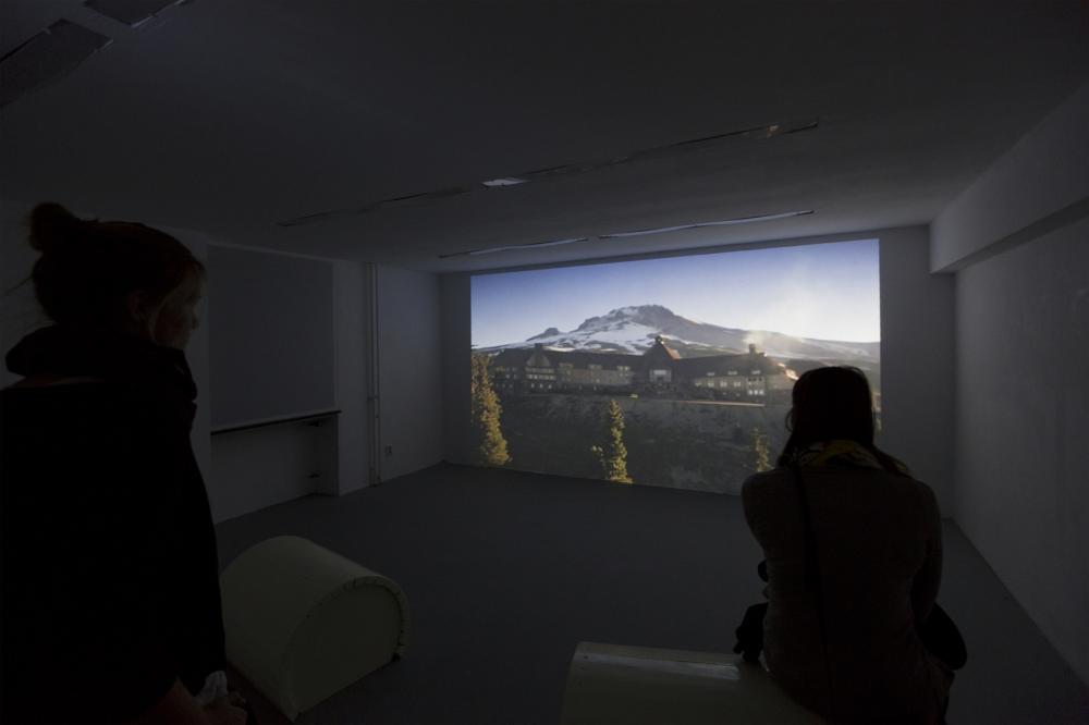 Das prächtige Hotel türmt sich zwischen den grünen Tannengipfeln in den Bergen auf. Ein einzelnes Fahrzeug ist auf dem Parkplatz zurückgeblieben. Nur noch die Giebel des Gebäudes sind unter der dicken Schneeschicht sichtbar. Stille und Einsamkeit umhüllen das Haus. Die Künstlerin isoliert hier Filmeinstellungen aus Stanley Kubrick’s Thriller The Shining (1980), die ausschließlich die Fassade des „Overlook Hotels“ zeigen. Unweigerlich wird diese friedlich wirkende Hausansicht zur Projektionsfläche des verstörenden Inhalts von The Shining, der geprägt ist von der psychologischen Transformation des Protagonisten.