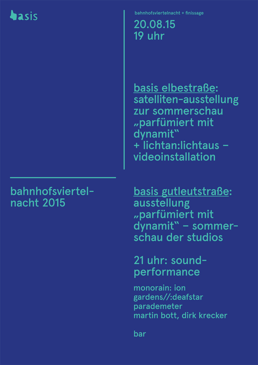 Im Rahmen der diesjährigen Bahnhofsviertelnacht findet die Finissage der Sommerschau "Parfümiert mit Dynamit" statt. Neben der Sound-Performance „monorain:ion gardens//:deafstar parademeter“ von Martin Bott und Dirk Krecker in der Gutleutstraße, beinhaltet unser Programm darüber hinaus eine Satelliten-Ausstellung zur Sommerschau im Projektraum der Elbestraße und eine Fassaden-Projektion von LichtAn:LichtAus auf die Weißfrauenkirche.
