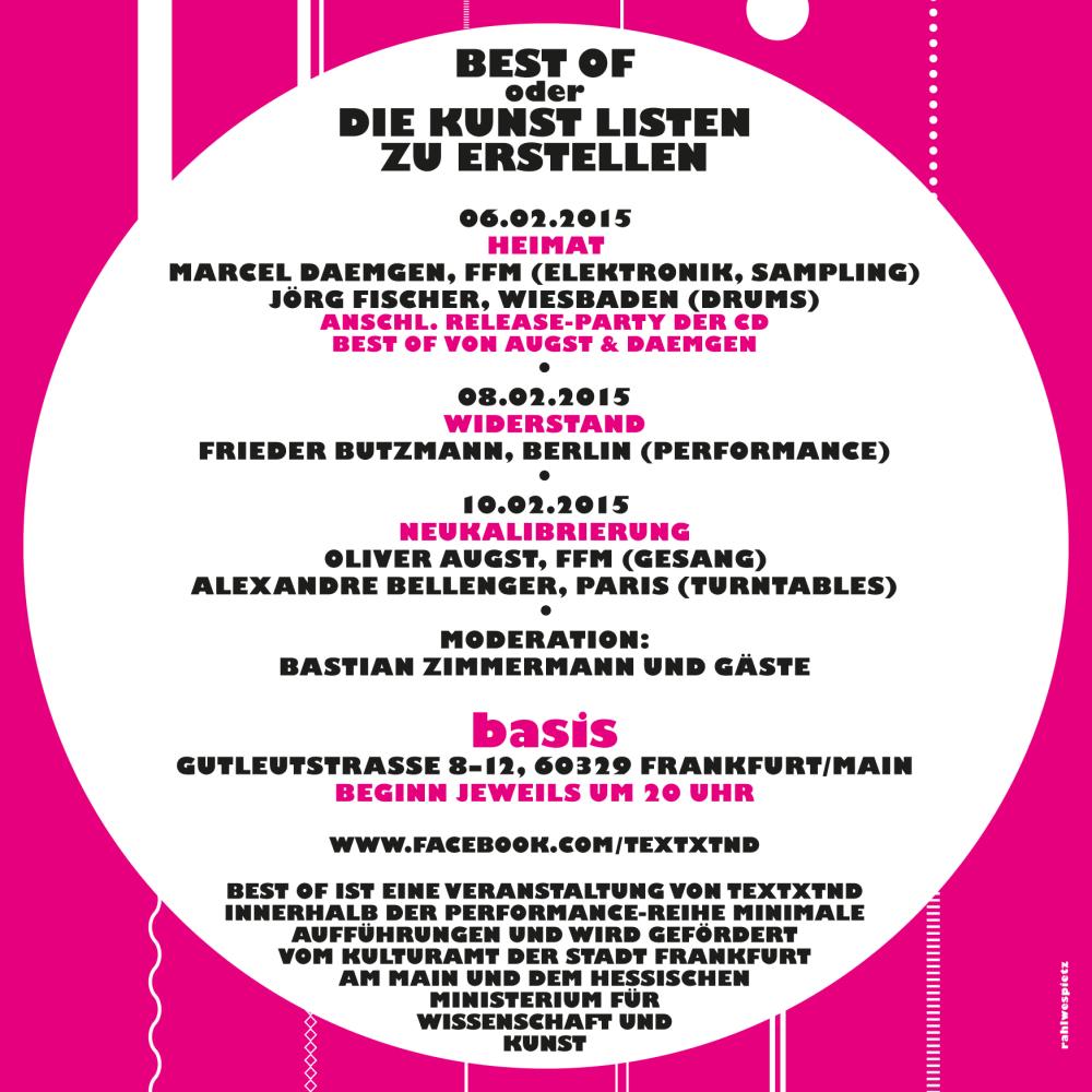 Was tun, wenn der Labelchef sagt, es sei nun an der Zeit, ein BEST-OF-Album zu produzieren? „BEST OF oder Die Kunst Listen zu erstellen“ initiiert ein Spiel mit der hierarchischsten Form aller Listen. Geboten werden: Drei Abende voller Musik, Diskurs und Witz sowie eine BEST-OF-CD, die sich selber mehr als Behauptung begreift.