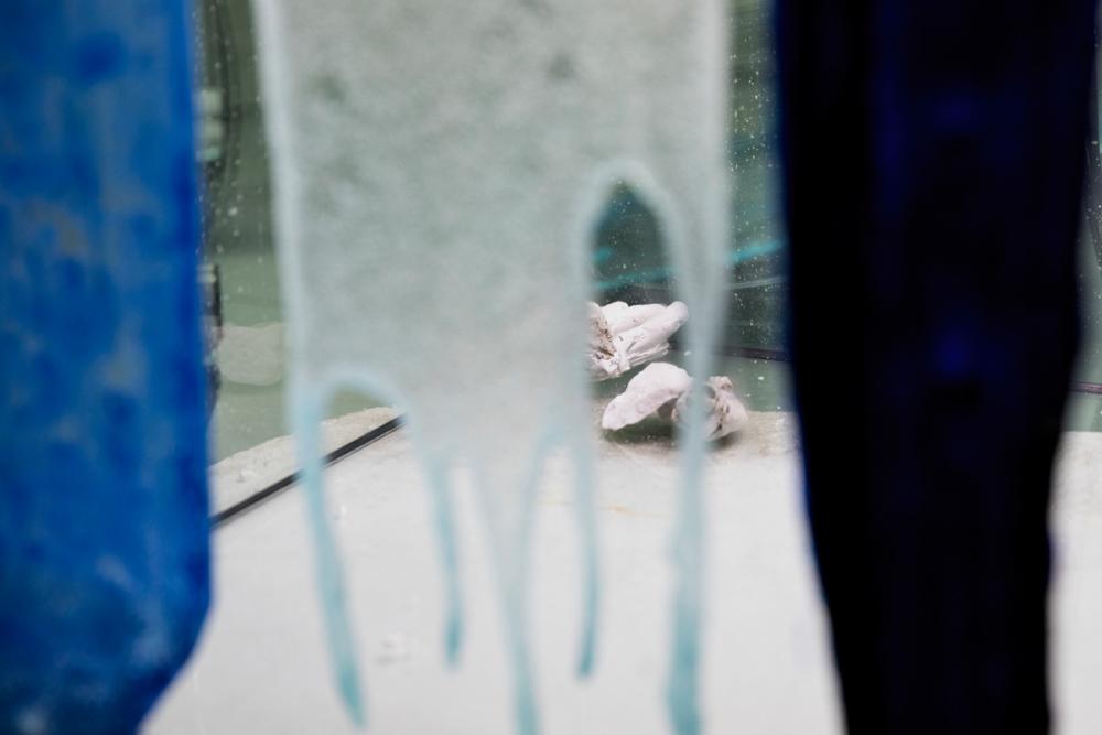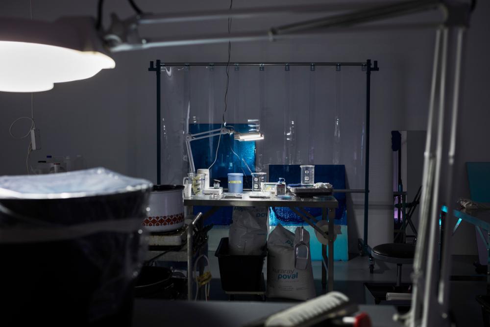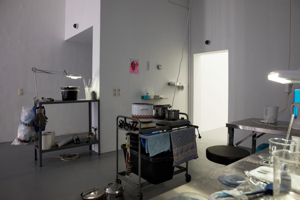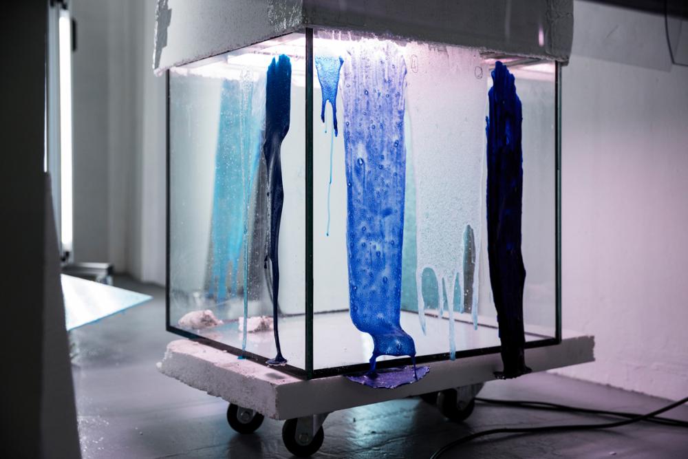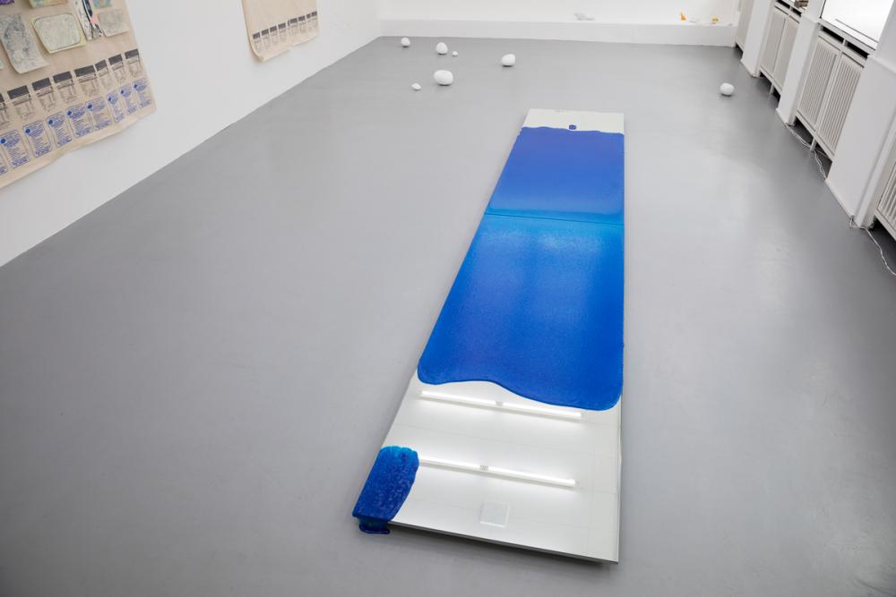 All the art pieces are brought together within the expanding lab of the Frankfurt-based collective HazMatLab, consisting of Sandra Havlicek, Tina Kohlmann and Katharina Schücke. By using scientific experimentation methodologies as investigations into art-making and collaboration, they push the boundaries between chemistry, biology, art and scientific imagination. They are queering the concept and space of a lab by occupying it with their practice and turning it into a place of failure and experimentation, while using their multilayered tentacular thinking as the foundation of their shared practice. The three-person team employs materials like nail polish, slime or crystals to co-create their research area, and exhibit their ongoing collective shared-knowledge practice by expanding their studio into the exhibition space within the same building, while cultivating it.