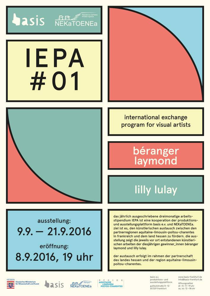 The three-month IEPA artist grant, a cooperation between the basis e.V. production & exhibition platform and NEKaTOENa, is offered annually. Its aim is to promote exchange in the field of art between the partner regions of Aquitaine-Limousin-Poitou-Charentes in France and the German Federal State of Hesse. On view in the exhibition are works produced during the residency by this year’s winners Béranger Laymond and Lilly Lulay.