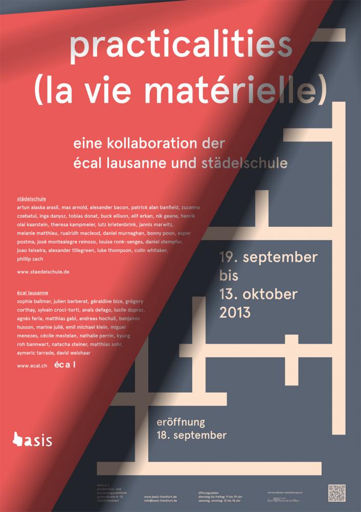 Wir freuen uns Ihnen vom 19. September bis zum 13. Oktober 2013 die Ausstellung Practicalities (La vie matérielle), eine Kollaboration zwischen dem Masterstudiengang Fine Arts an der ECAL/Ecole cantonale d`art de Lausanne und der Klasse von Willem de Rooij an der Städelschule in Frankfurt, präsentieren zu dürfen.